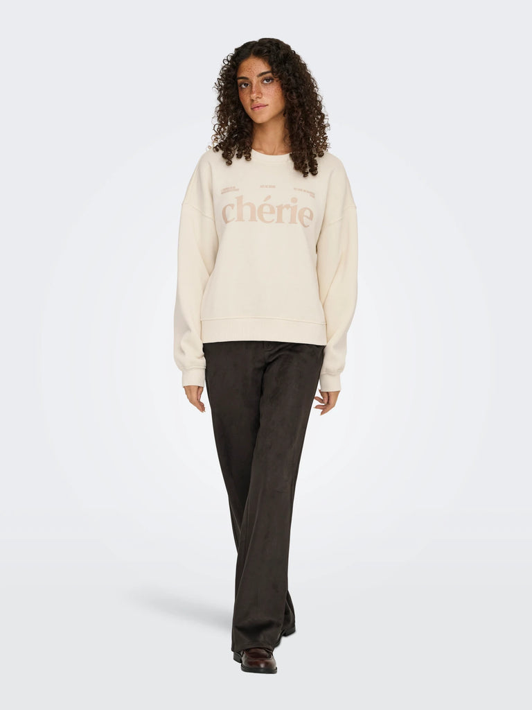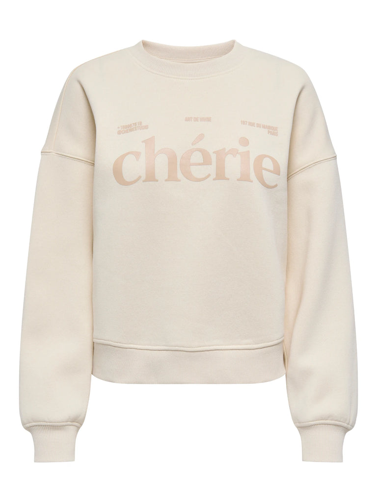 Leuke sweater met ronde hals en print "CHERIE" leuk om te combineren met een toffe jeans, rokje..... ook met een sneaker is deze TOP.